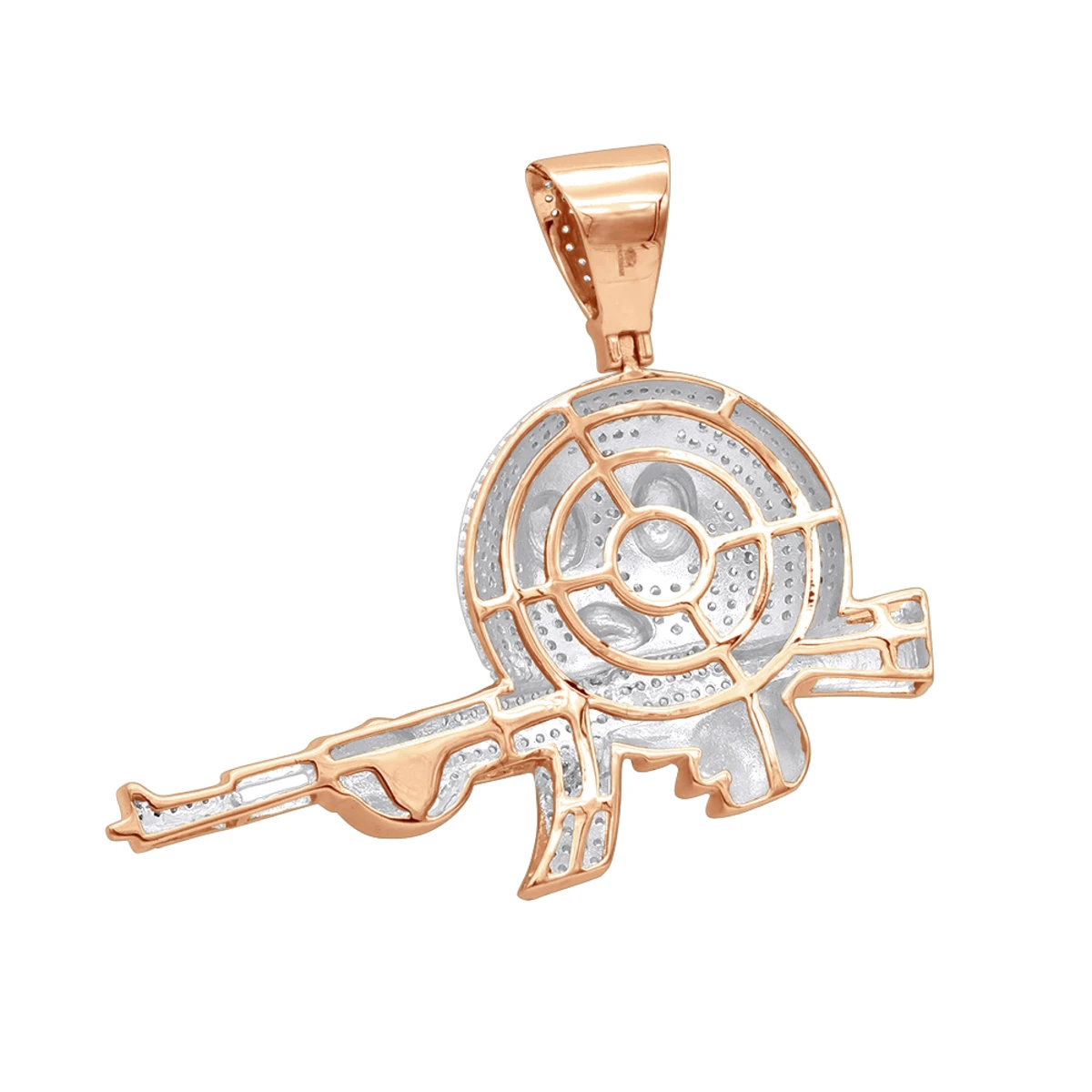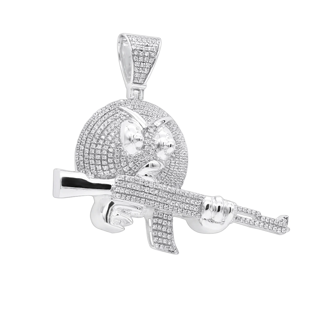 From our Custom Jewelry Collection: This unique real 10K Gold Angry Emoji with AK47 Machine Gun Diamond Pendant is made from solid 10k gold and is decorated with 1.2 carats of pave set genuine diamonds, this men’s diamond pendant weighs approximately 12 grams and showcases a unique 3-D design of an angry emoji with a gun and a highly polished gold finish, this awesome men’s diamond pendant is meant to stand out. The pendant is just over an inch and a half long with bail: 1 5/8in. (41mm), and just over 2 inches wide: 2 1/11in. (52mm). This amazing pendant is definitely an eye-catcher and is available in 10K white, yellow or rose gold. You also can personalize this piece or check we’ve already made and create your own design.