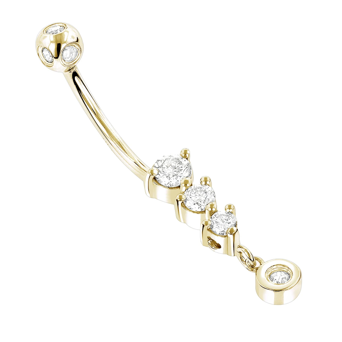 This 14K Gold Dangling Diamond Belly Button Ring from our gold body jewelry collection showcases 0.6 carats of sparkling round diamonds. Featuring a luxurious design and a highly polished gold finish, this diamond belly button ring is available in 14K white, yellow and rose gold, and is fully customizable.
