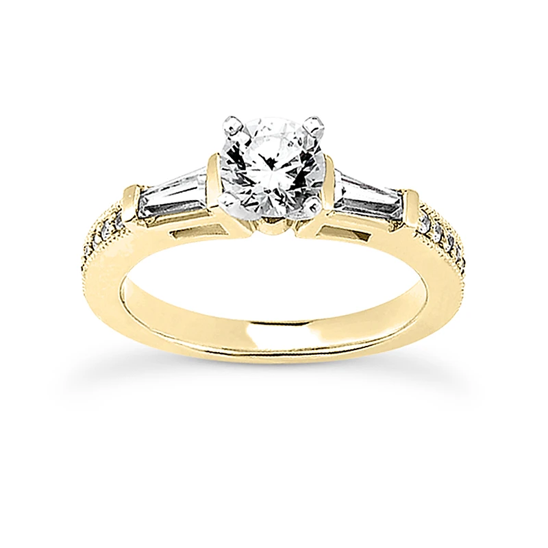 This 14K Gold Diamond Designer Engagement Ring set consists of a diamond engagement ring and matching diamond band. The ring showcases a 0.50 carat round diamond in the center and 0.38 carats of round & baguette diamonds on the sides for a total of 0.88 carats of dazzling diamonds. The Engagement band showcases 0.57 carats of dazzling round & baguette diamonds. This set is available in Platinum, 18k or 14k yellow, rose, white gold, various sizes, and can be customized with any color and quality diamonds. Please contact us if you would like to customize it.
