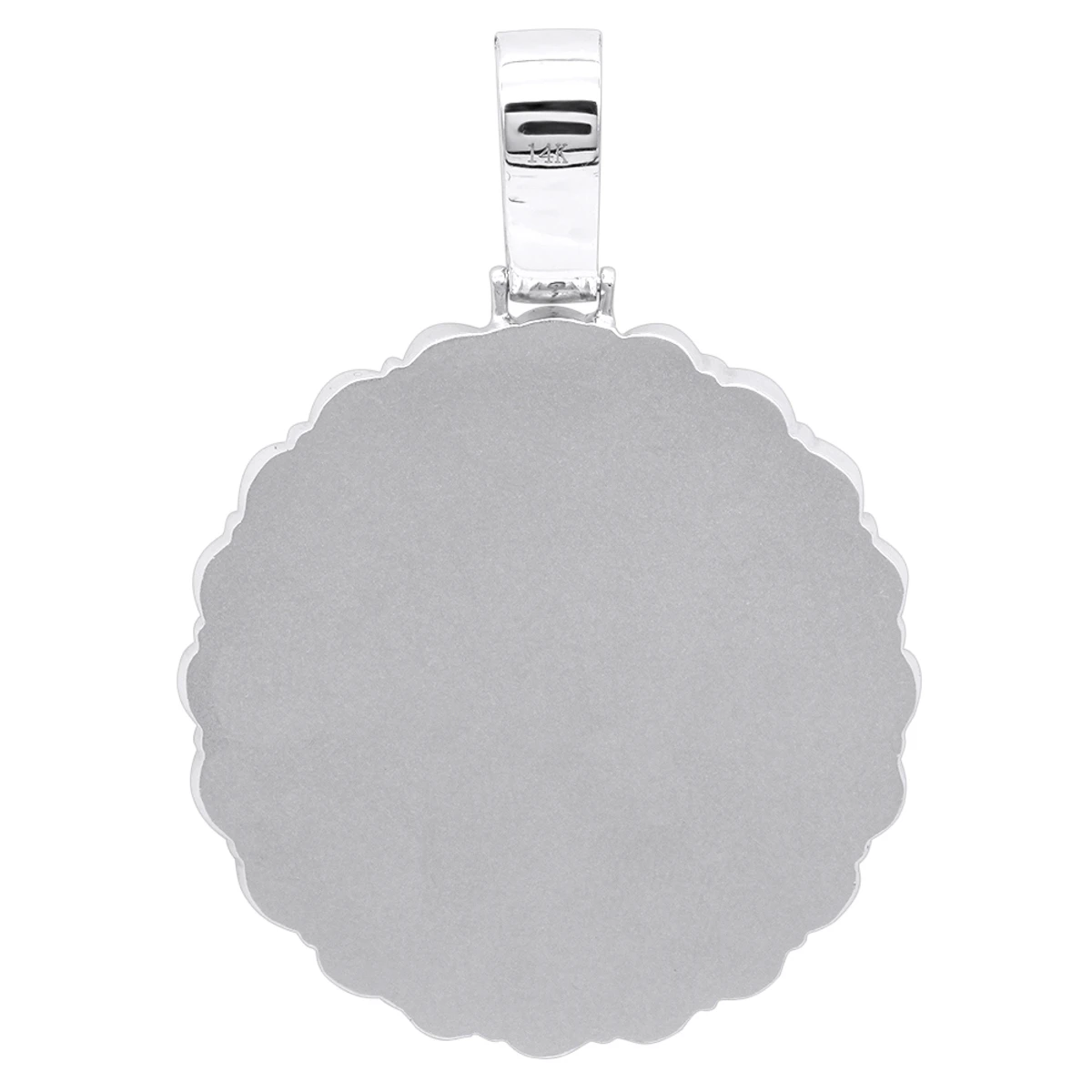 From our customizable diamond pendants collection: this 14K Gold Fully Customizable with Photo or Engraving Diamond Pendant features 2.5 carat weight and the timeless round shape creating a striking medallion. The prong set groups of white round diamonds forming flowers along with a row of smaller diamonds around the medallions center will illuminate any photo you’ll chose to customize this pendant with. The bail is also showcasing 18 round white diamonds for the most brilliant look. This stylish diamond pendant can make a perfect matching gift and help you memorize a special moment. The pendant is about 2 inches (51mm) long with the bail, and about 1.5 inches (37mm) wide, nice and heavy weighting approximately 33 grams. Available in yellow, white or rose gold. Chain must be purchased separately. We can also make it in any size or customize this medallion in any other way you would like. You also can personalize this piece or check we’ve already made and create your own design.