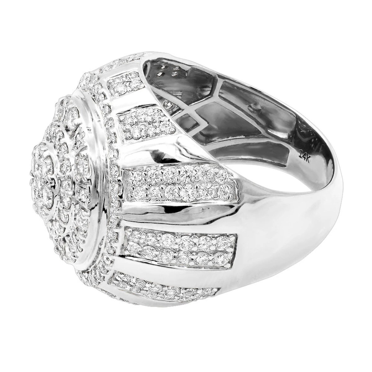 From our statement rings and men’s diamond rings collections: The modern take on a men’s ring, this 14k Gold Men’s Diamond 3D Design Statement Ring with a dome shape design and 3.5 carats of sparkling round diamonds is absolutely unforgettable. Featuring an array of precious white round diamonds scattered all over the voluminous 14k gold base this striking ring makes a dazzling statement. Having a one of a kind geometrical design and expertly crafted to meet the highest industry standards, this ring will make a brilliant addition to ones jewelry collection and set the tone for all future adds on with it’s impeccable style and flawless quality. Being nearly 1 inch (23mm) wide, this stunning diamond ring also makes a great men’s pinky ring. It is available in 14k white, yellow and rose gold and will leave a long lasting impression in every gold color.