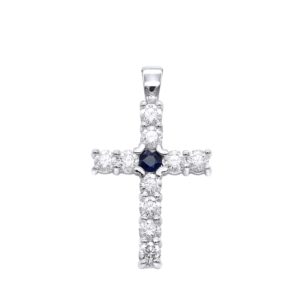 From our diamond cross pendants collection: This lovely 14K Gold Sapphire and Diamond Ladies Cross Pendant by Luxurman features 10 sparkling round cut white diamonds and a beautiful blue sapphire as a central stone totaling 1.32 carats, each stone masterfully prong set in a 14K gold frame. This gorgeous diamond cross pendant for women is available in 14K white, yellow and rose gold as well as 18k gold and Platinum as a custom order. Please contact us if you would like to customize it! You also can personalize this piece or check we’ve already made and create your own design.