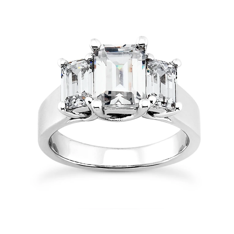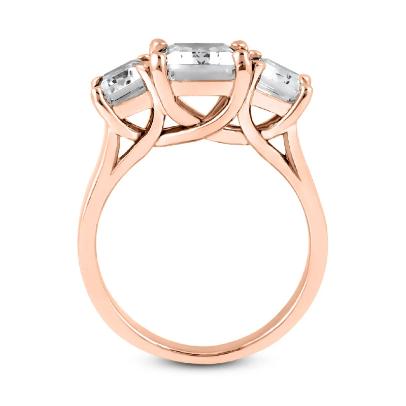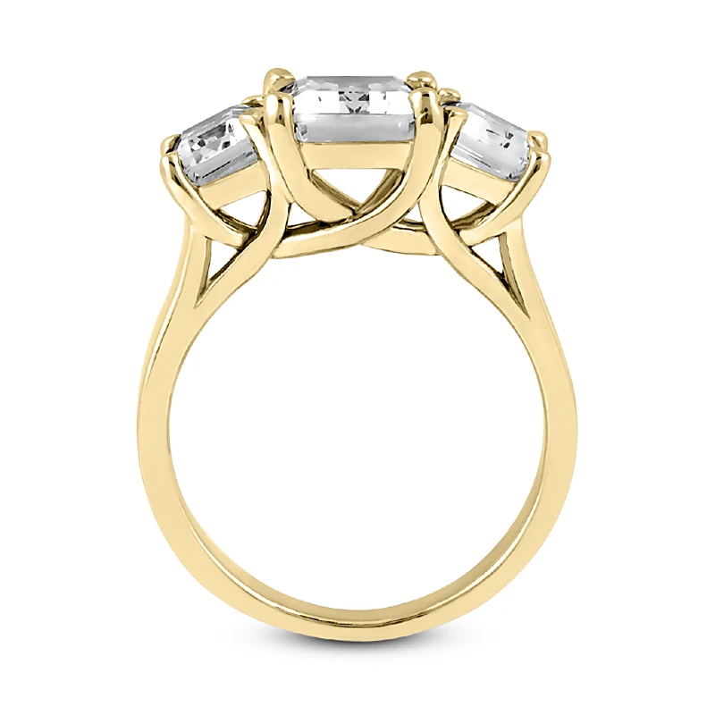 This 18K Gold Three Stones Diamond Ring features 0.25ct emerald cut center diamond and two 0.25ct emerald cut diamonds on the sides and is available in Platinum, 18k or 14k yellow, rose or white gold and various sizes. This three stone diamond ring can also be custom built to your specifications with diamond color and clarity of your choice. It might accommodate from 0.25ct to 4ct center diamond and from 0.25ct to 2.50ct side diamonds (each). Call us at 212-398-3123 if you have any questions or would like us to customize it to your specifications.