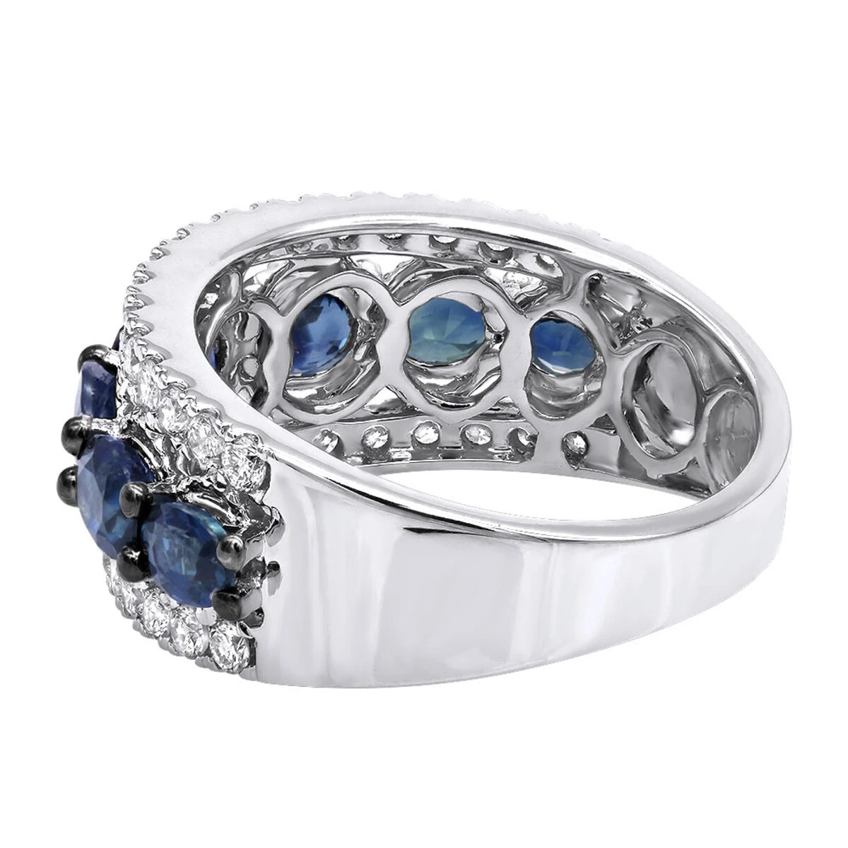 From our diamond cocktail rings collection: A modern and graphic design, this 4 carat Diamond and Blue Sapphires Ring for Women by LUXURMAN features a particularly intricate band design, two lines of sparkling white round diamonds framing the 7 admirable oval cut blue sapphires and a highly polished gold finish. What makes this ring even more unique and special are rhodium plated prongs which lend character and brightness to the deep blue gemstones. This ladies ring is made in 14k gold, weights approximately 6 grams and can be worn as cocktail ring or a very unique wedding band. The ring features a total of 4 carats of sparkling diamonds and blue sapphires, the band is 10mm wide, available in 14k yellow gold, white gold and rose gold.