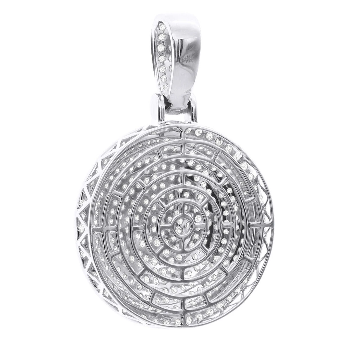 This dazzling 14K Gold Diamond Iced Out Medallion Pendant for Men 4 Carat features an array of perfectly aligned natural diamonds set in rows and covering the whole surface of it’s circle shape. The item is 1 3/16 in (30mm) wide, 1 7/8 in (47mm) long including the incrusted bail and weighs approximately 12 grams. This massive sparkling medallion pendant is available in 14K white, yellow or rose gold and will be a show stopper in any color. Order today! Please note: chain is for illustration purposes and can be purchased separately. You also can personalize this piece or check we’ve already made and create your own design.