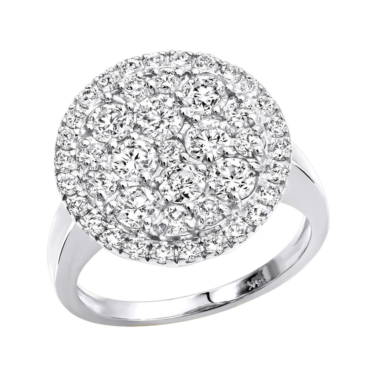 This gorgeous Men’s Diamond Engagement ring by Luxurman is made in solid 14k gold and features exquisite round diamonds, each pave set in a highly polished solid gold frame for a cluster look of one huge diamond. Impressive in it’s quality and style, this stunning engagement ring displays 5 carats of dazzling white round diamonds filling the round shaped golden base in an intricate way. The ring is pretty large being 13/16in (20mm) wide. This amazing men’s diamond ring is available in 14K white, yellow and rose gold and will make a great addition to your jewelry collection (ring can also be custom made in 18k gold as well as Platinum as a custom order).