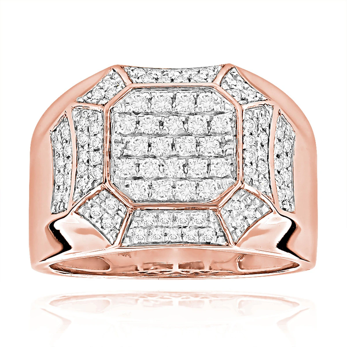 Designer Diamond Rings For Men by Luxurman: This Men’s Diamond Ring available in 14K White gold, Yellow gold and Rose gold weighs approximately 14 grams and paved in 1 carats of sparkling round diamonds. This exquisite men’s diamond designer ring features a fine gallery back and can be worn as a regular ring, pinky ring or a unique wedding band.
