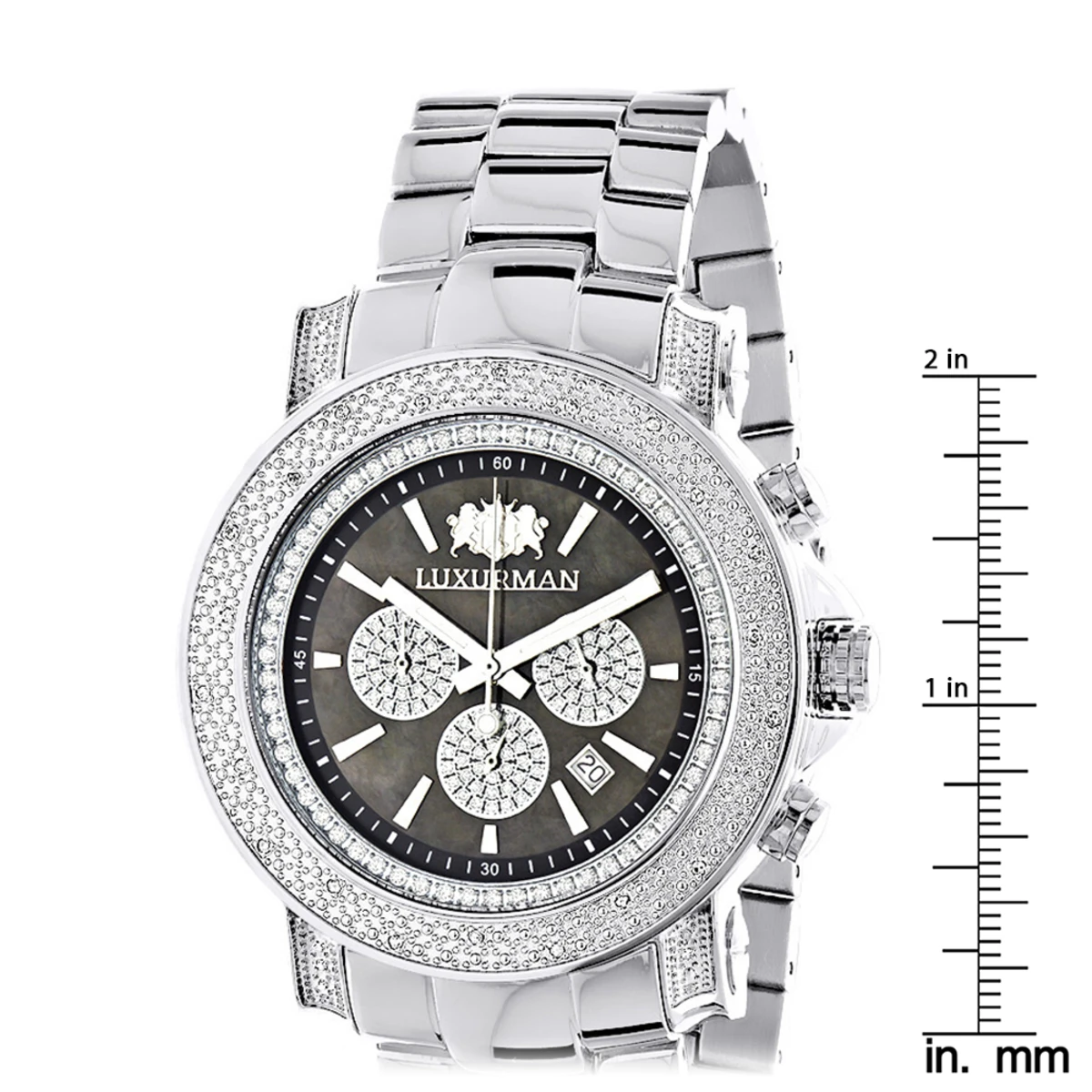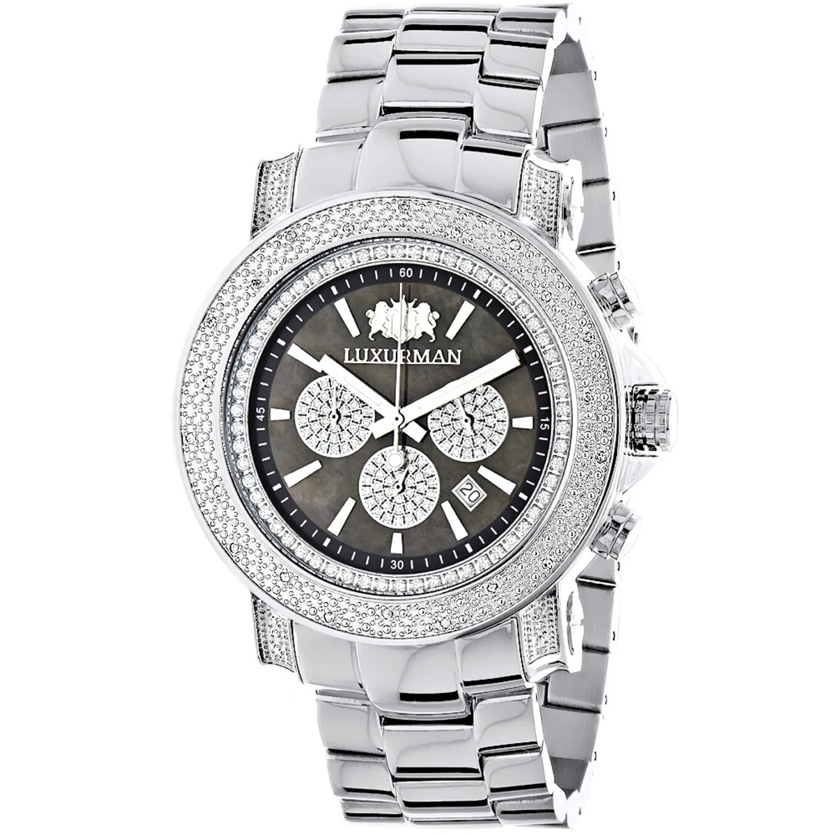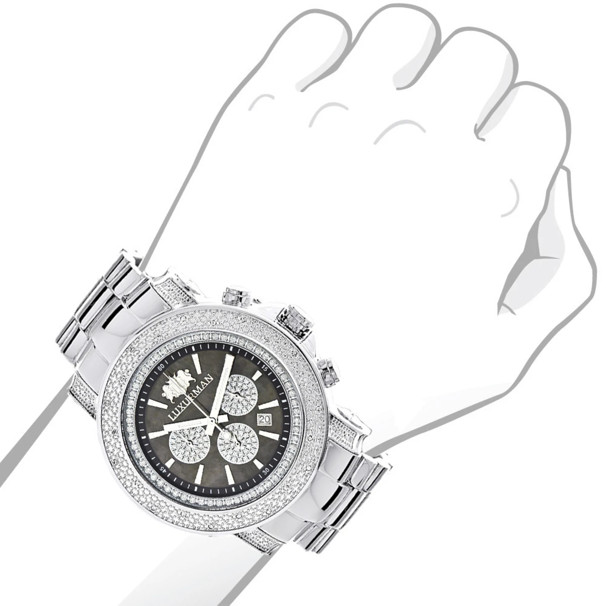 This Heavy Men’s Diamond Watch Luxurman Escalade Black MOP with Chrohograph showcases 0.75 carats of genuine diamonds and features a black mother of pearl dial accented with white sparkling stones with three chronograph subdials, a date display window, and a silver tone stainless steel bracelet. This luxurious men’s diamond watch by Luxurman houses a fine Japan-made quartz movement and comes with two extra interchangeable leather straps in different colors (band colors may vary).