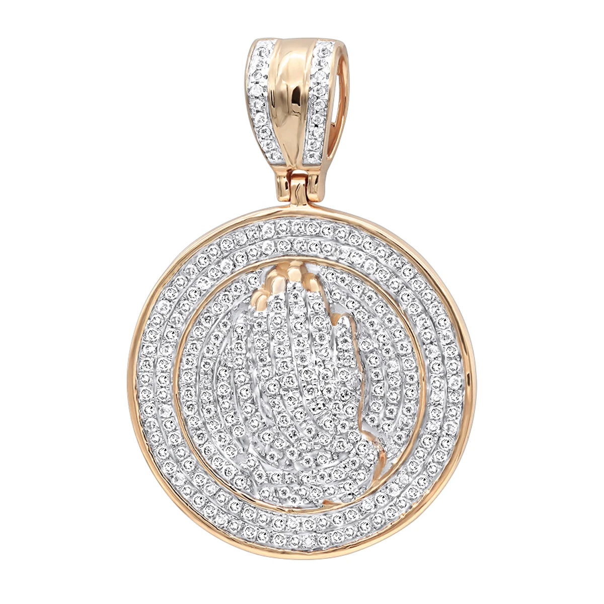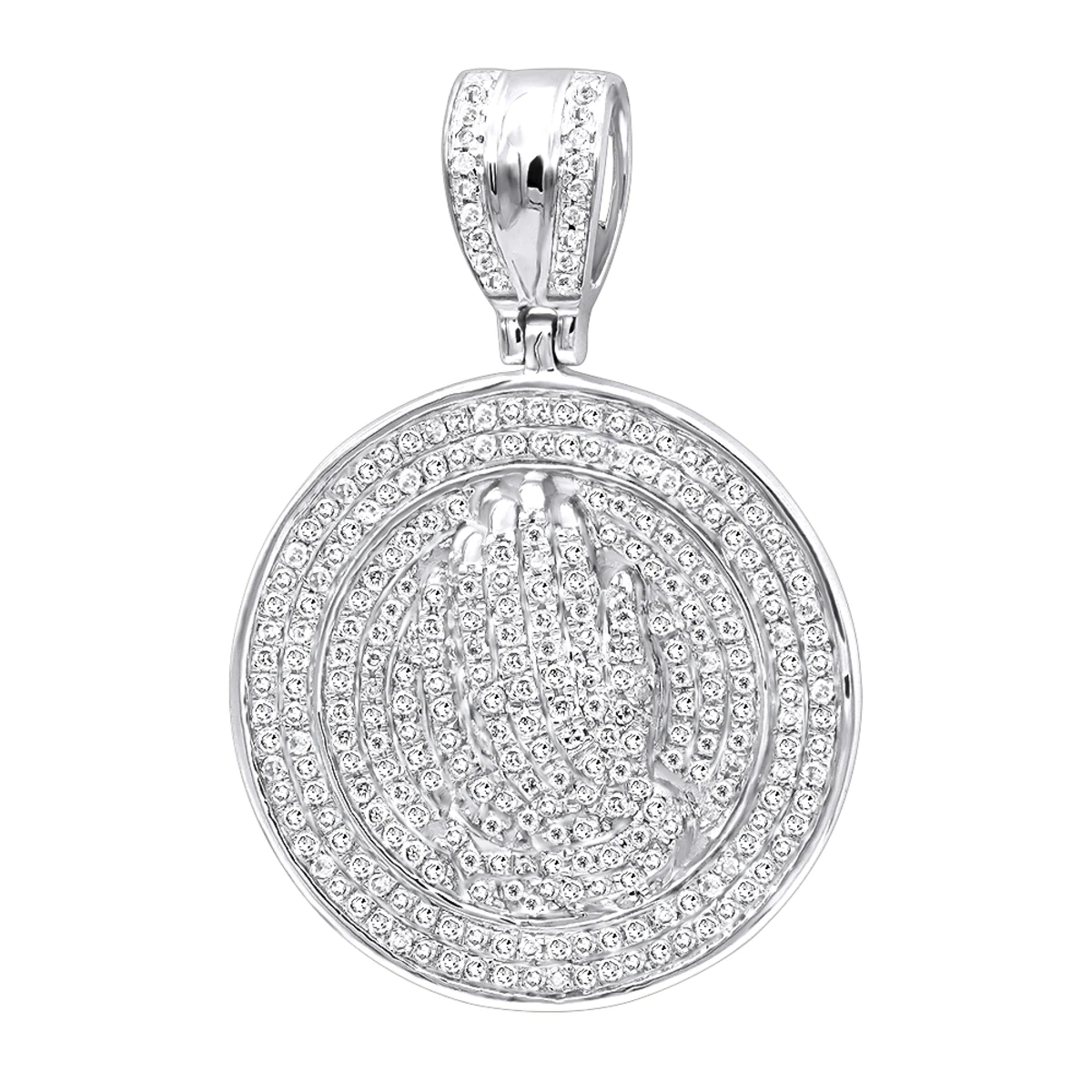 Hip Hop Jewelry: these Praying Hands Diamond Pendant for Men by Luxurman features a round medallion design with a bail and 3D hands in a prayer fully iced out in 0.9 carats of genuine diamonds; this men’s diamond pendant really packs a sparkle and makes a unique religious and style statement; available in 14k white gold, yellow gold and rose gold You also can personalize this piece or check we’ve already made and create your own design.
