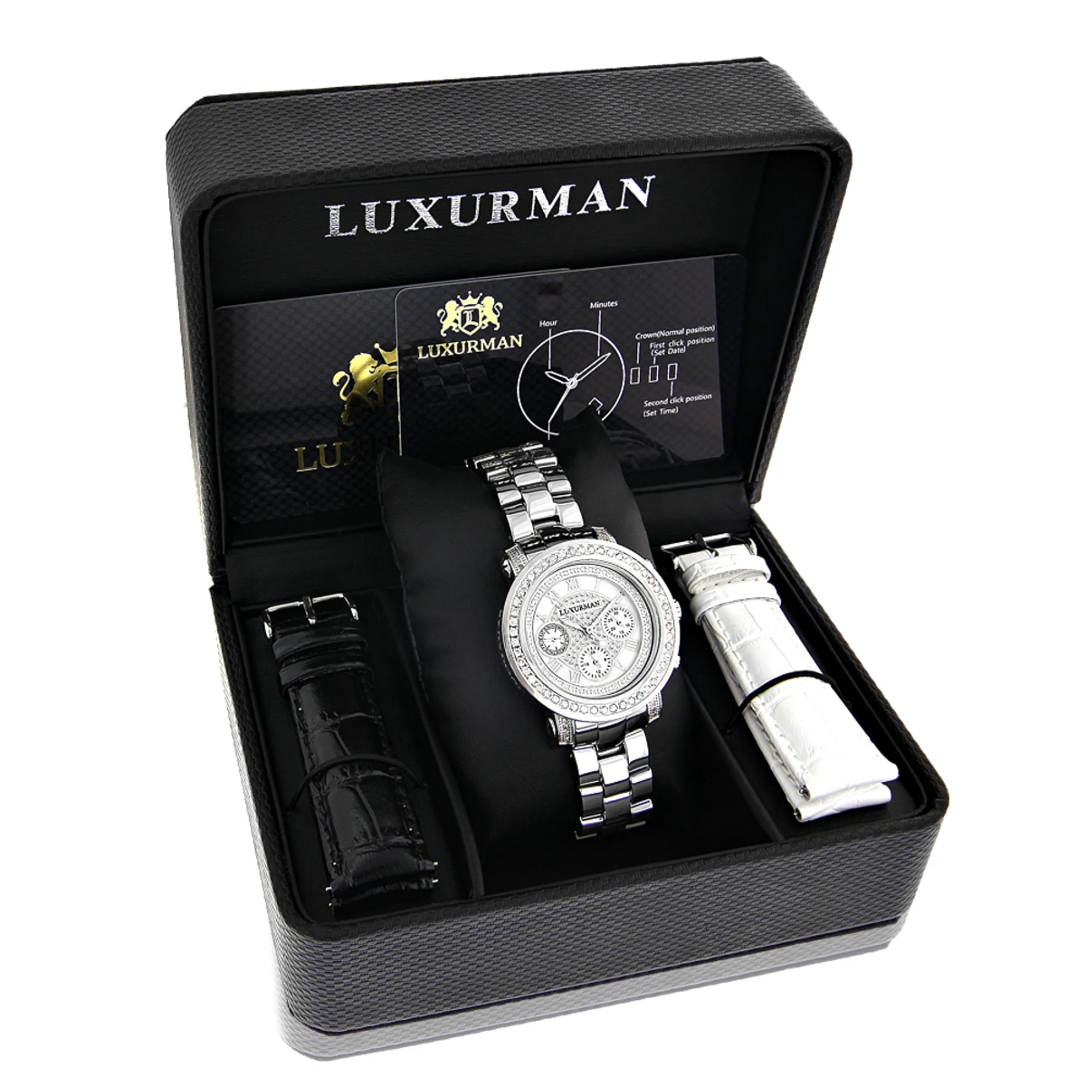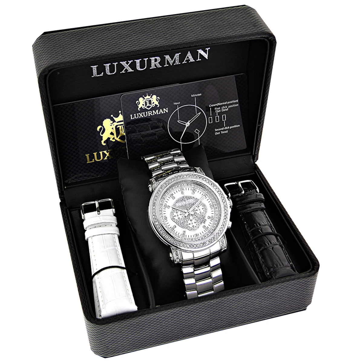 Designer Large Luxurman Phantom 0.12ct Black Diamond Watch For Men White Dial