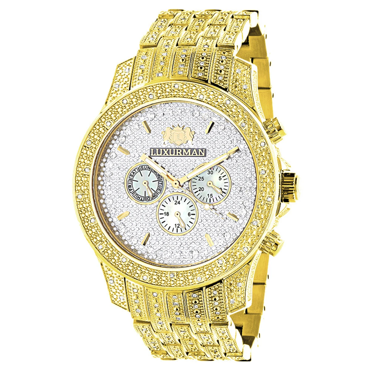 This Iced Out Luxurman Men’s Diamond Watch Yellow Gold Tone showcases 1.25 carats of genuine diamonds masterfully set on the bezel, sides, lugs and the band, features a polished 18k yellow gold plated stainless steel case with a yellow gold tone stainless steel band and a dial paved in white sparkling stones with three subdials. This Diamond Watch by Luxurman comes with two extra interchangeable leather straps in different colors. This Luxurman Diamond watch is a perfect present for any occasion.