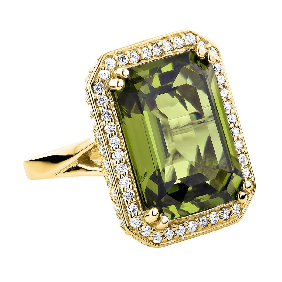 You deserve this Ladies 14K Gold Peridot Quartz Gemstone Diamond Cocktail Ring from our Gemstone Diamond Rings collection. The 1.75 carats of Round cut diamonds set in solid 14K gold frame provides beautiful decoration to this high end diamond cocktail ring showcasing a fabulous 13-carat synthetic peridot quartz. Solidly made with 14 grams of gold. Made in USA.