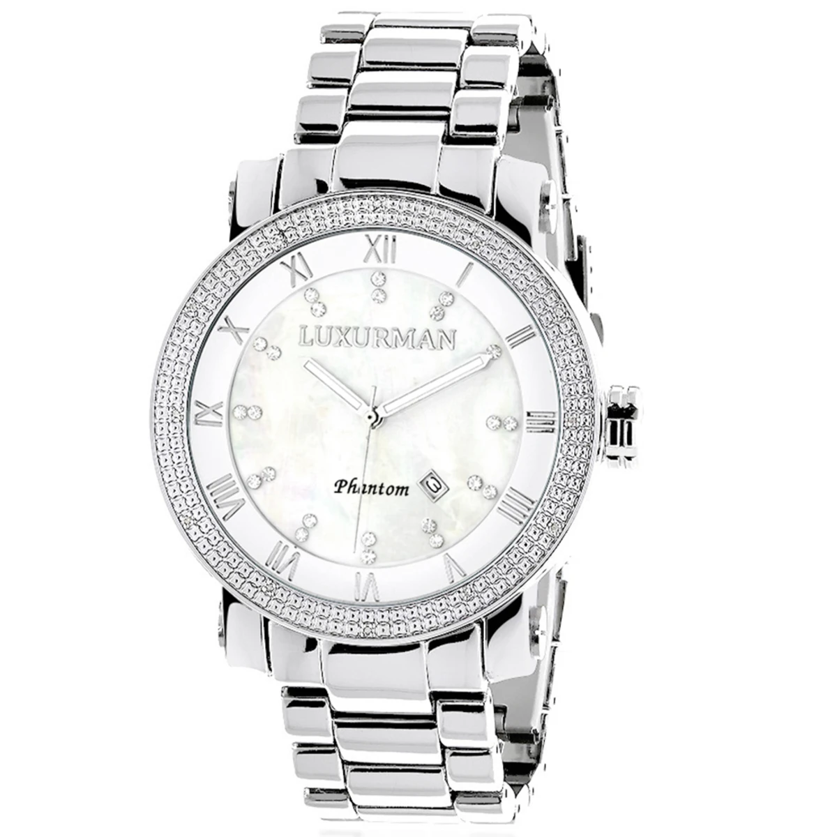 Luxurious Luxurman Diamond Watches! This Men’s Diamond Watch features 0.12 carats of genuine diamonds, a polished silver tone stainless steel case with a stainless steel band, a white mother of pearl dial with day, date and 24 hours subdials. This Luxurman diamond watch is conveniently water-resistant to 30 m (110 ft).