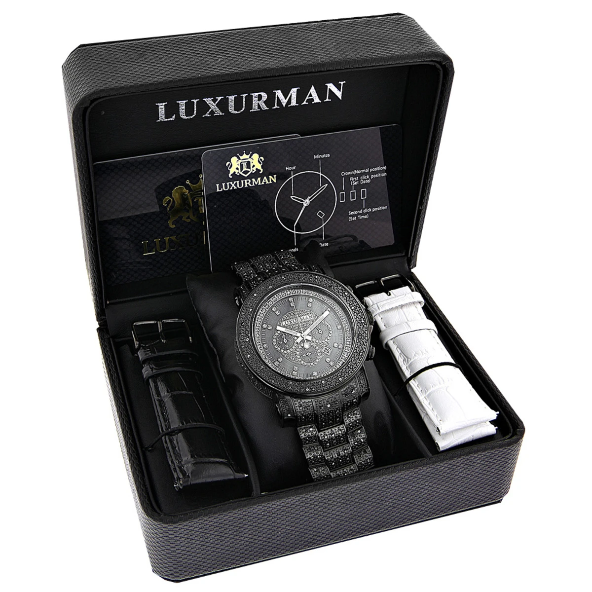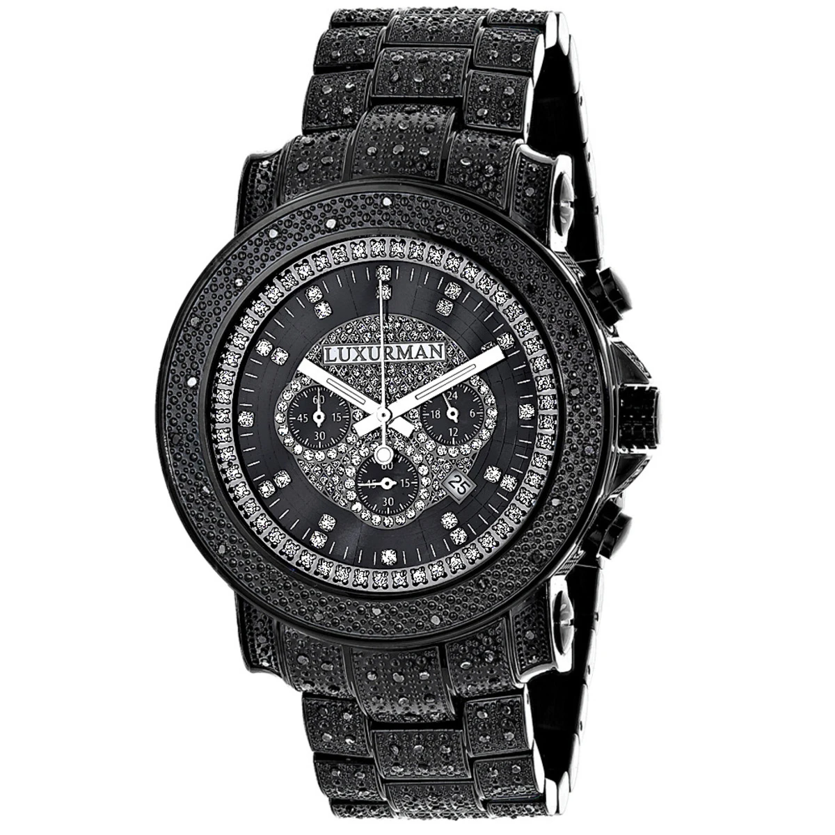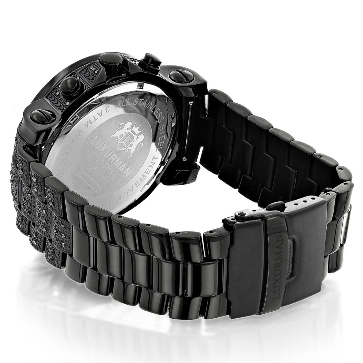 This Luxurman Fully Paved Oversized Iced Out Black Diamond Black Dial Men’s Watch 2ct is fully paved with 2 carats of real black diamonds, and features a black tone stainless steel case and a polished stainless steel band paved with black diamonds. This Escalade Luxurman watch features black mother of pearl dial with three chronograph subdials, a date display window at the 4 o’clock position. This Luxurman men’s black diamond watch makes a unique gift for a special occasion.