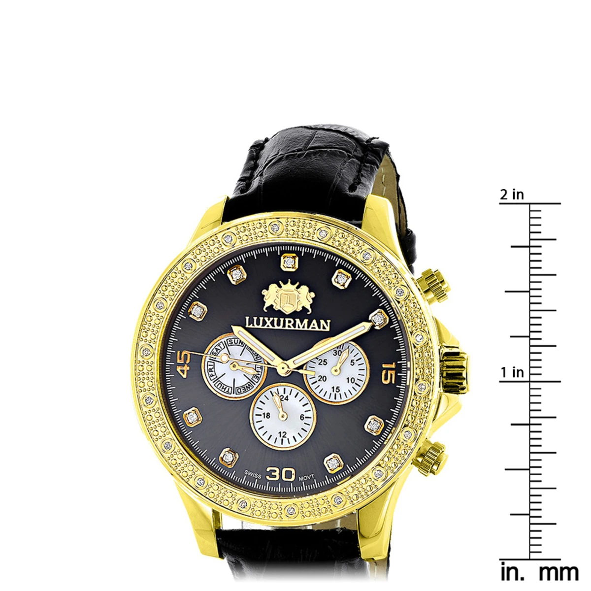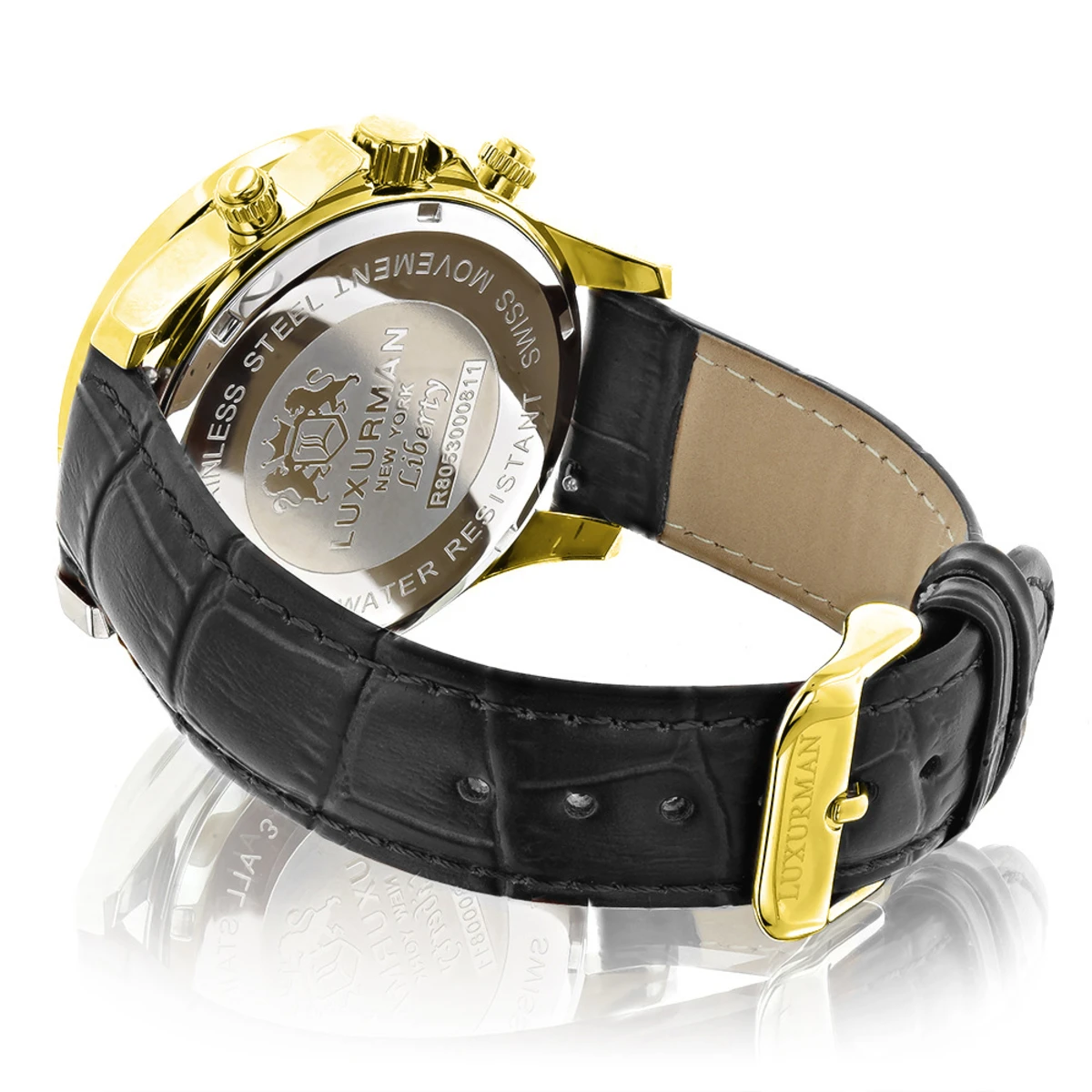 This Luxurman Men’s Diamond Watch Black MOP Liberty is 18k yellow gold plated and features 0.2 carats of genuine diamonds. Showcasing a luxurious black mother of pearl face, date/day/24hour white MOP subdials, 18k gold plated stainless steel case, black leather band and Swiss quartz movement, this Luxurman men’s diamond watch is conveniently water-resistant to 3 ATM and comes with a 5 year manufacturer’s warranty. This stylish watch for men makes a perfect gift for any occasion! This Luxurman watch is sold brand new in retail packaging with full manufacturer’s warranty and also includes two extra leather bands in different colors.