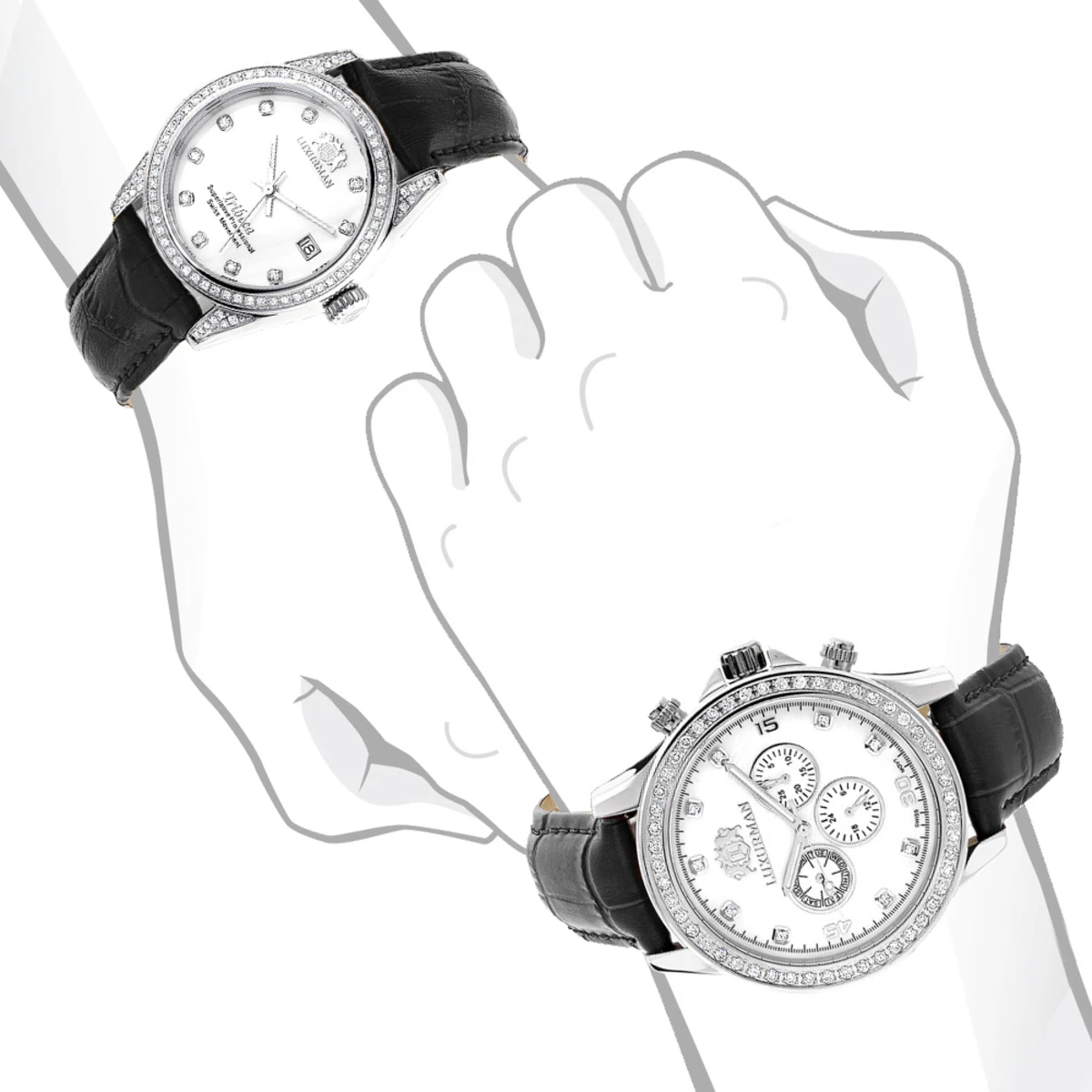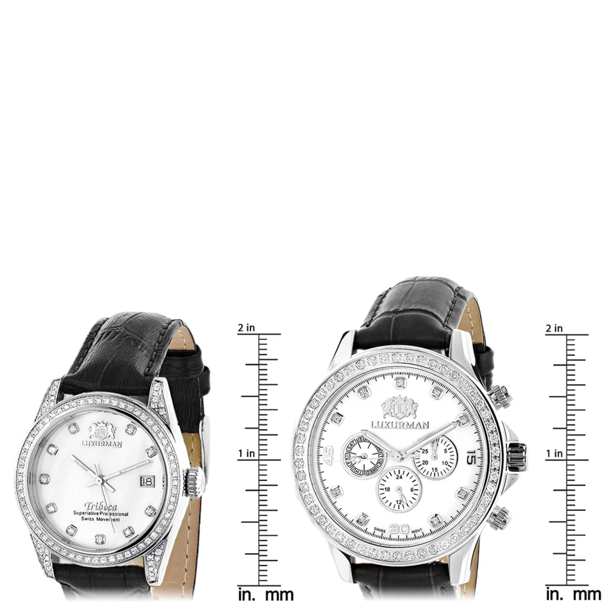 Matching His And Hers Luxurman Real Diamond Watch With Leather Band White MOP