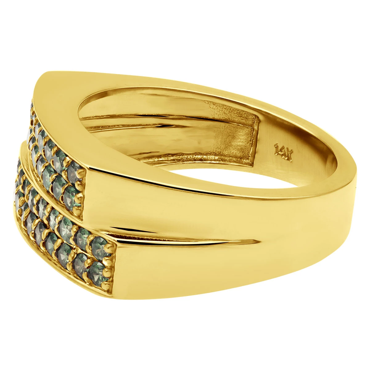 This exquisite Men’s Diamond Ring with Green Diamonds in 14k Gold features a Unique Design which can also worn as a wedding band is the perfect way to show your love and commitment. Crafted from 14k gold, this unique design of two halves coming together and features a stunning array of green diamonds set in a pave setting. The ring is approximately 10mm wide and is available in 14k yellow gold, white gold, rose gold, as well as 18k gold and platinum as a custom order.This ring is perfect for any special occasion, to be worn as an everyday ring or as a wedding band, or anniversary. The unique design is sure to make a statement and will be sure to be admired by all. The ring is also engravable, so you can add a special message or date to make it even more special. We can customize this men’s diamond ring with other color diamonds such as white, yellow, black, blue, rose, or with gemstones to your specifications or even make a completely new design. Buy this unique green diamond ring as it is or contact us to customize it to your specifications.Made in New York, USA.