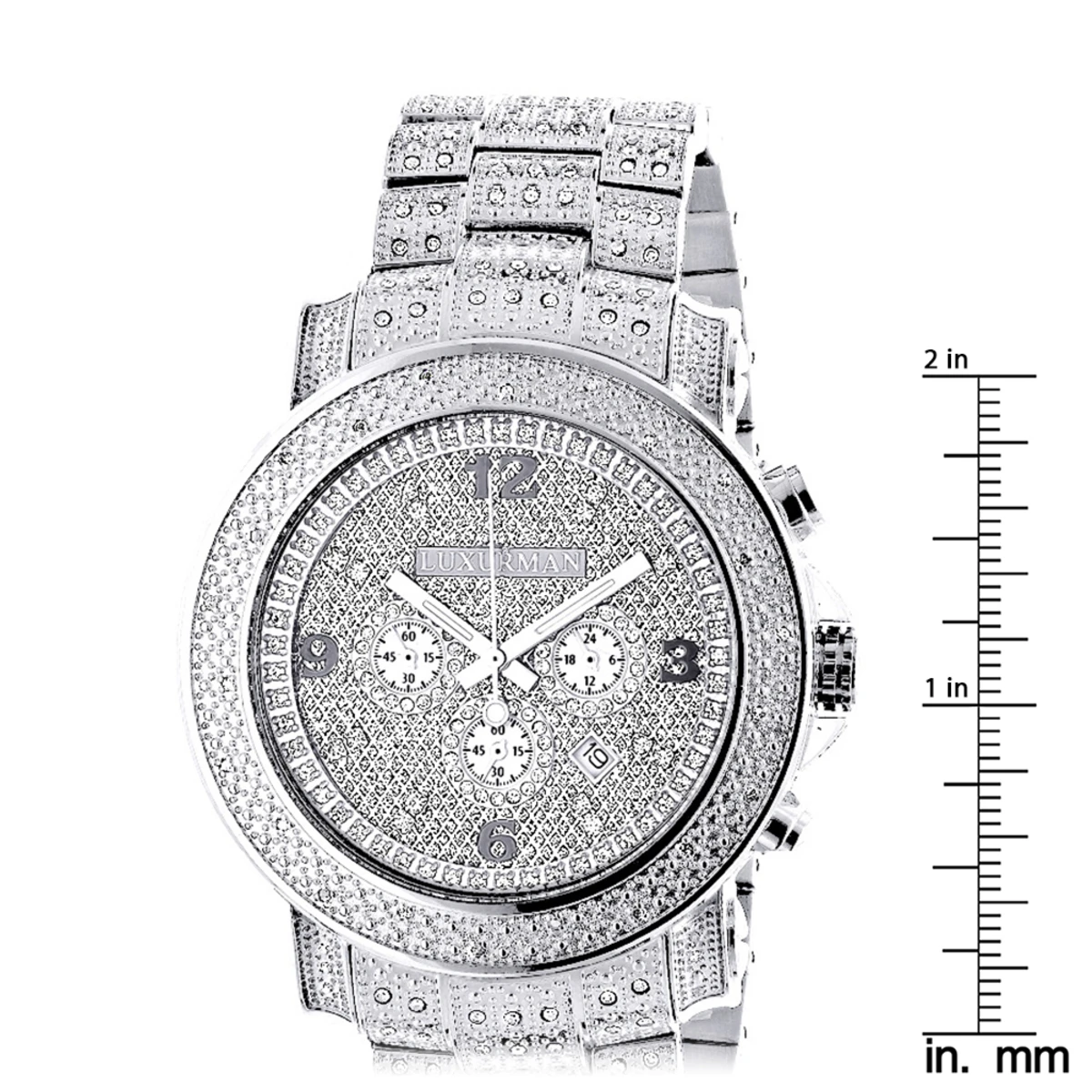 This Oversized Iced Out Men’s Diamond Watch by Luxurman features 2 carats of sparkling round diamonds, a white gold plated stainless steel case and band and is fully paved in sparkling white diamonds. The dial of this LUXURMAN wrist watch paved in white sparking stones showcases three white mother of pearl chronograph subdials and a date window. This men’s diamond watch is a fantastic gift for a special occasion.