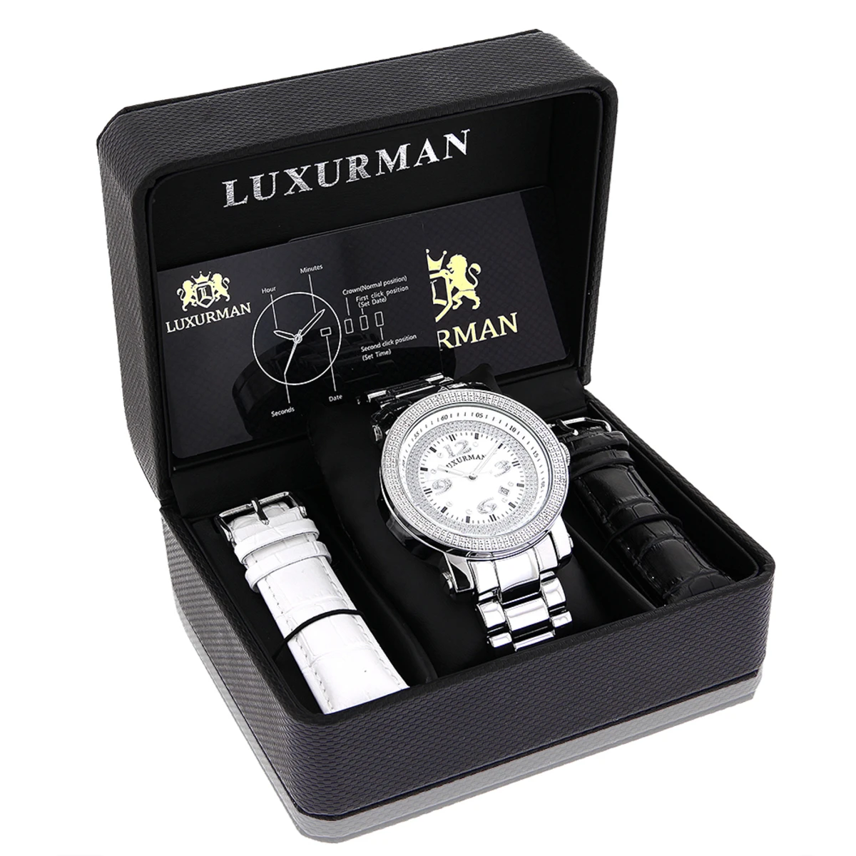 Oversized Men’s Diamond Watch 0.12ct Iced Out Luxurman White MOP Face & Metal Band