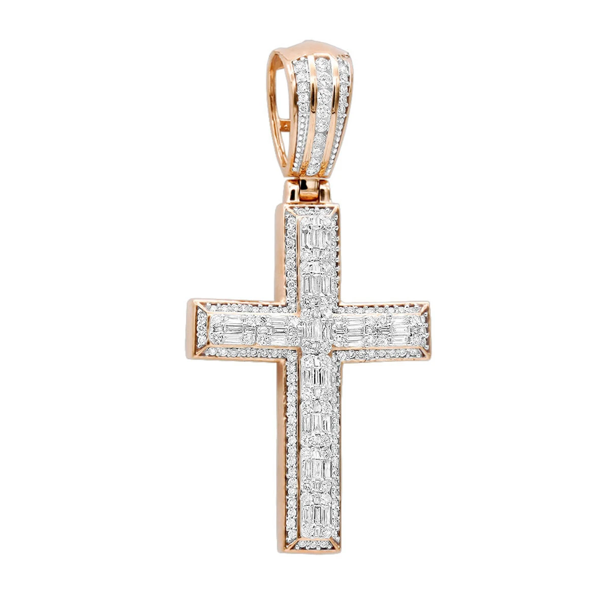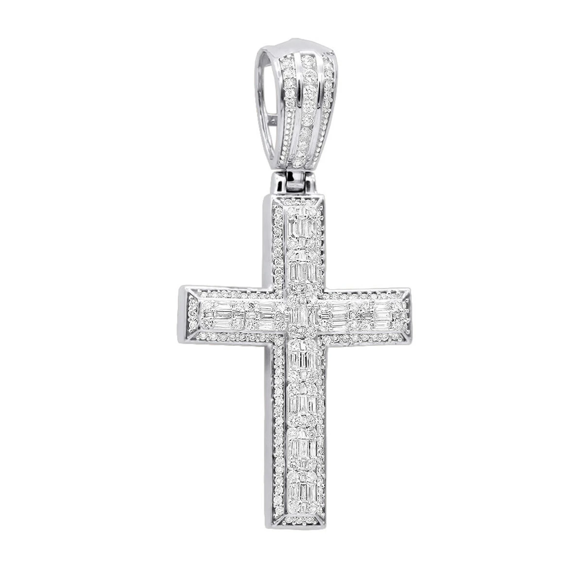 This Large Baguette and Round Diamonds Men’s Cross from our religious jewelry and men’s diamond pendants collections presents an array of multi shape diamonds – smaller round diamonds and bigger baguette white diamonds weighing 1.5 carats, the cross is manufactured in high quality 14K gold. Featuring a unique intricate design and a fantastic incrusted bail for even more sparkling, this men’s diamond cross possesses the power to elevate any and every outfit. An unusual sight – blazing baguette diamonds illuminating the classic shape of this stunning cross alongside the round cut diamonds framing them are making this pendant unforgettable. This amazing diamond cross pendant for men is quite large at over 1.5 inches long: 1 9/13in. (45mm) including the bail and is available in 14K white, yellow and rose gold. Chain must be purchased separately. You also can personalize this piece or check we’ve already made and create your own design.