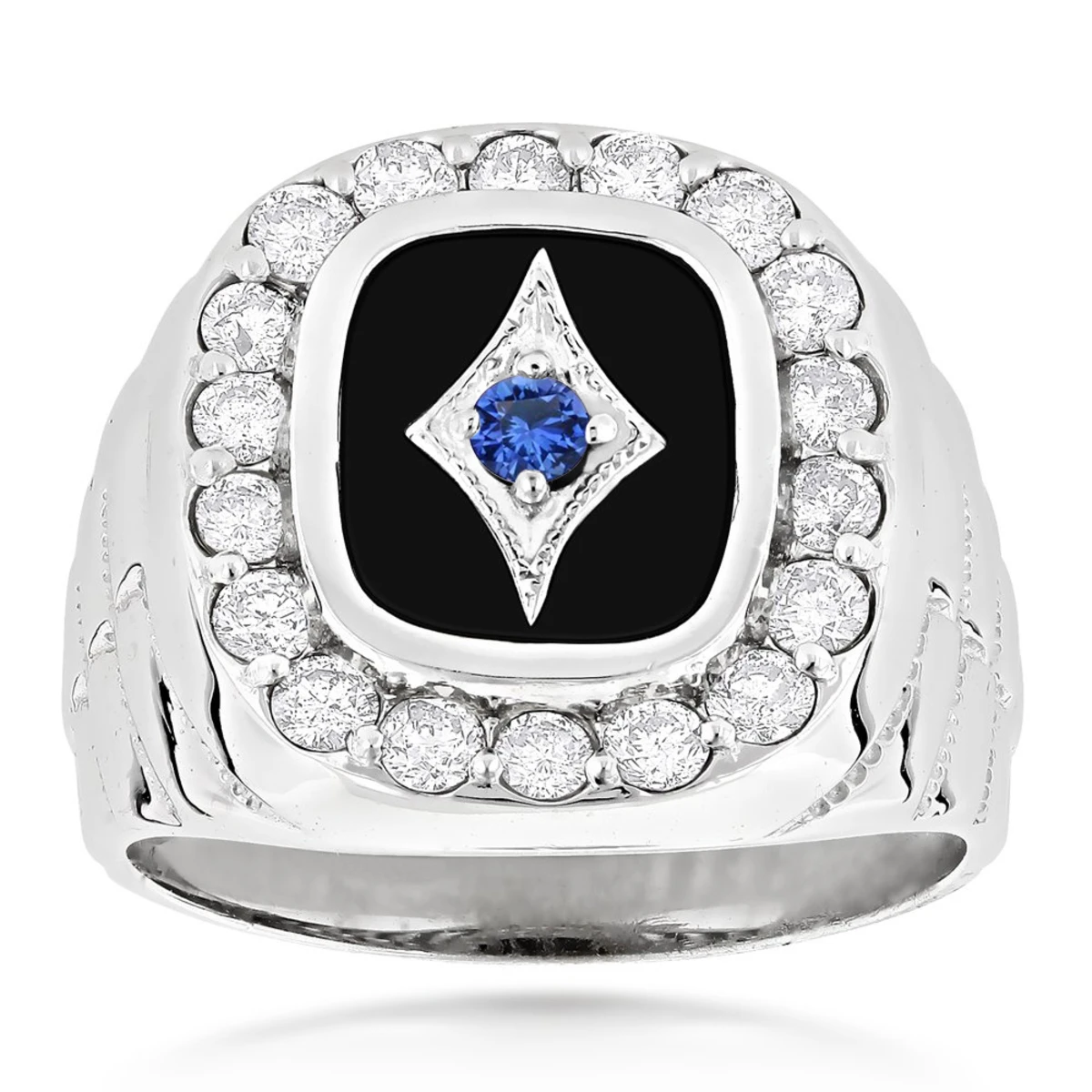 Unique 14K White Gold Black Onyx Blue Sapphire White Diamond Men’s Ring 1.68ct