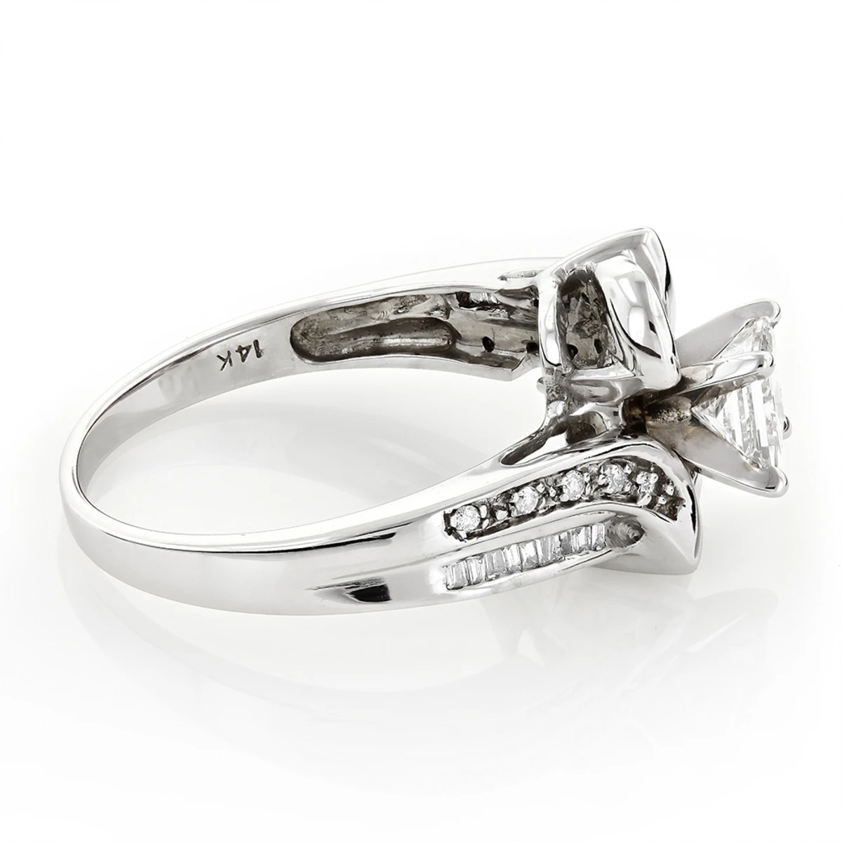 This Unique 14K Gold Pre-Set Diamond Engagement Ring showcases a 0.69-carat princess cut diamond in the center and 0.35 carats of round and baguette diamonds on the sides. Featuring an intricate design and a highly polished gold finish, this unique diamond engagement ring is available in 14K white, yellow and rose gold.