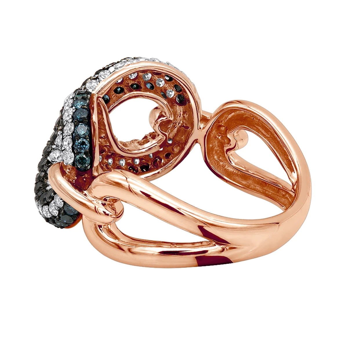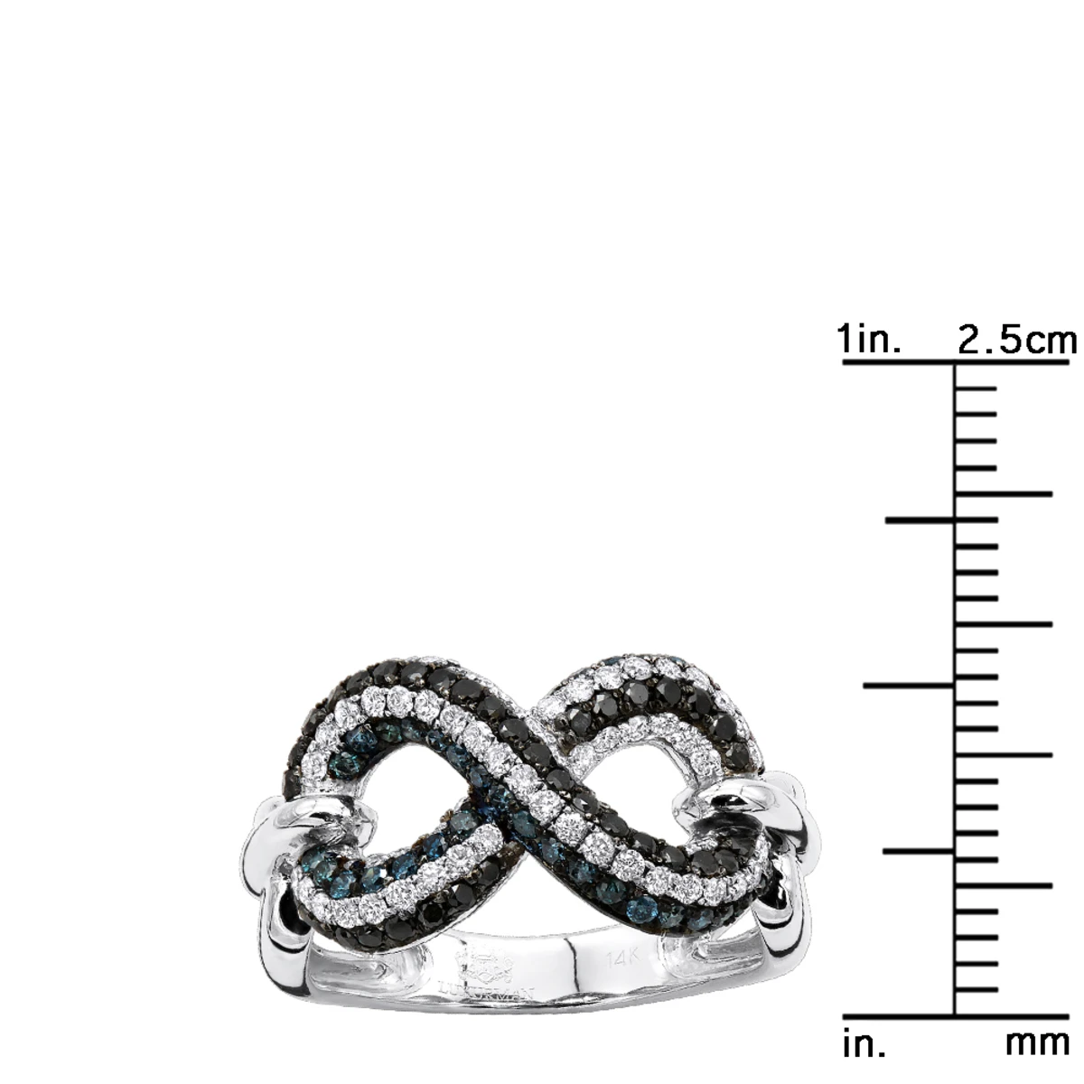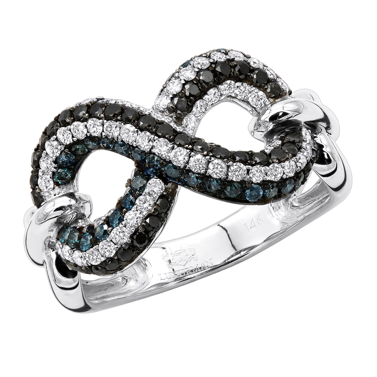 From our ladies diamond rings collection: This Unique White Blue Black Diamonds Cocktail Ring for Women is made in solid 14K Gold is a gorgeous example of a cocktail ring. A cocktail ring is a piece of jewelry that is larger than normal rings and is designed to attract attention with its design and colors. Showcasing a shape of an infinity sign covered in rows of white, black and blue round diamonds this ladies ring is truly unique. The infinity symbol signifies the concept of limitlessness or eternity, so the ring featuring this symbol can make a very meaningful present for a special occasion. The ring is 7/16in. (11mm) wide, available in 14k white, yellow and rose gold.