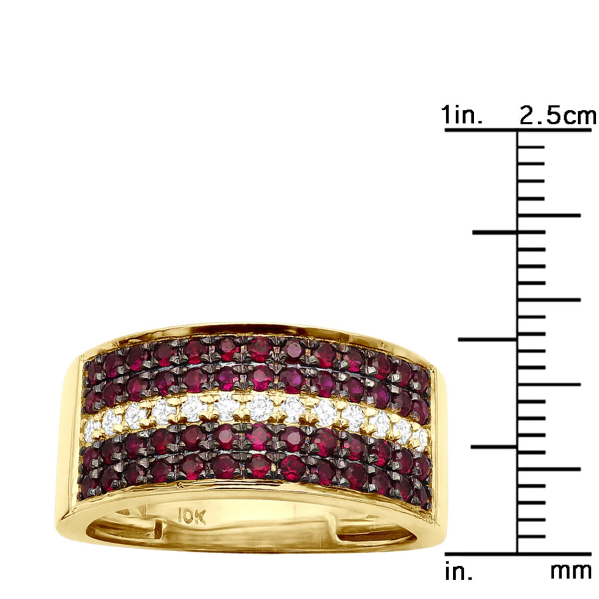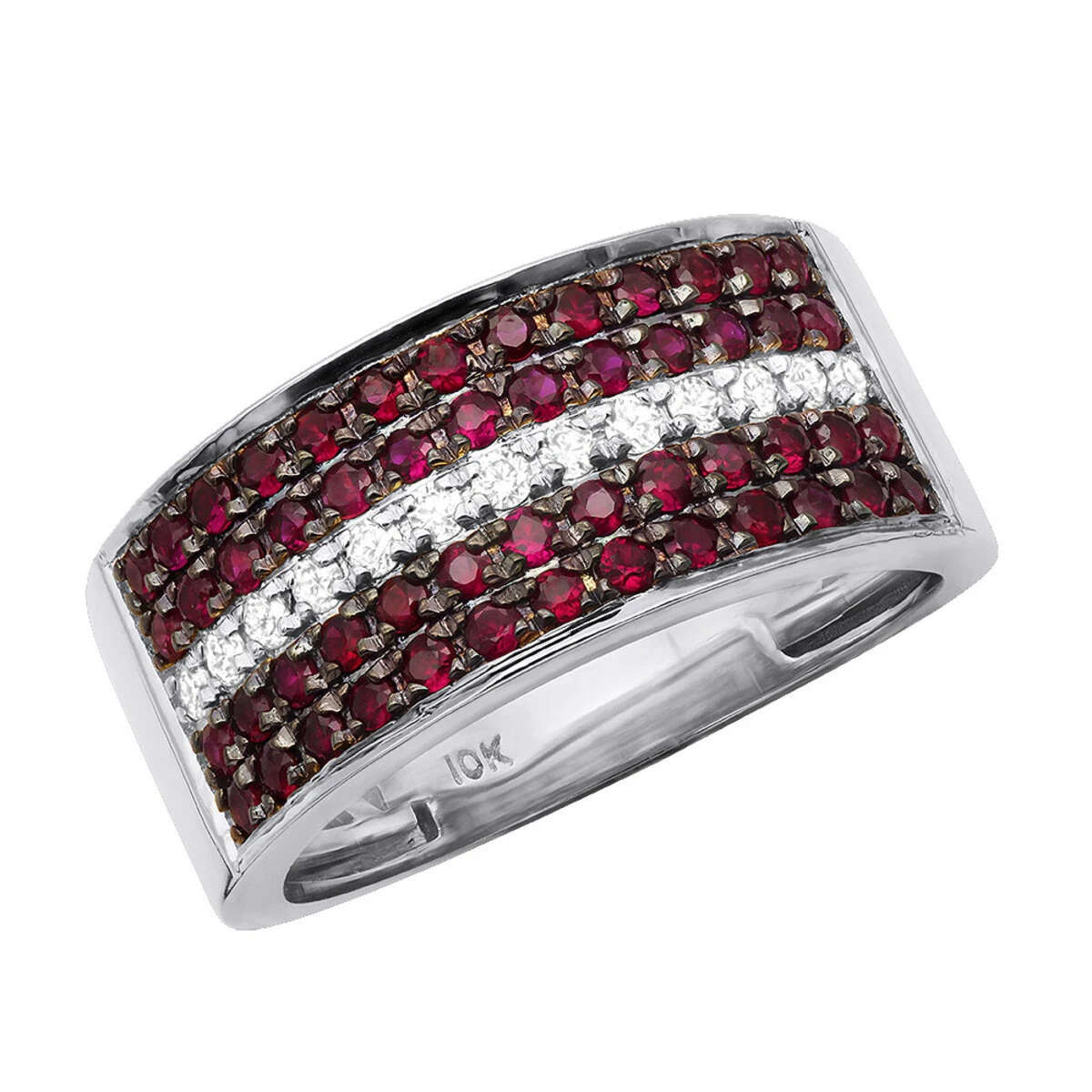 From our men’s diamond rings and wedding bands collection This very unique Unique Ring is 10K Gold 5 Row 2.25 Carat Diamond and Ruby Wedding Band for Men features superb craftsmanship and a cutting-edge design with sophisticated combination of gemstones and diamonds. The solid 10K gold band is lined above and below with 2 rows of splendidly red rubies, with the central row left for scintillating white diamonds bringing the total weight of gemstones in the ring to 2.25 carat. The band weighs approximately 7.5 grams and is 10mm wide; available in 10K white, yellow or rose gold. This ring can also be customized with different color diamonds and gemstones, please reach out to us for details.